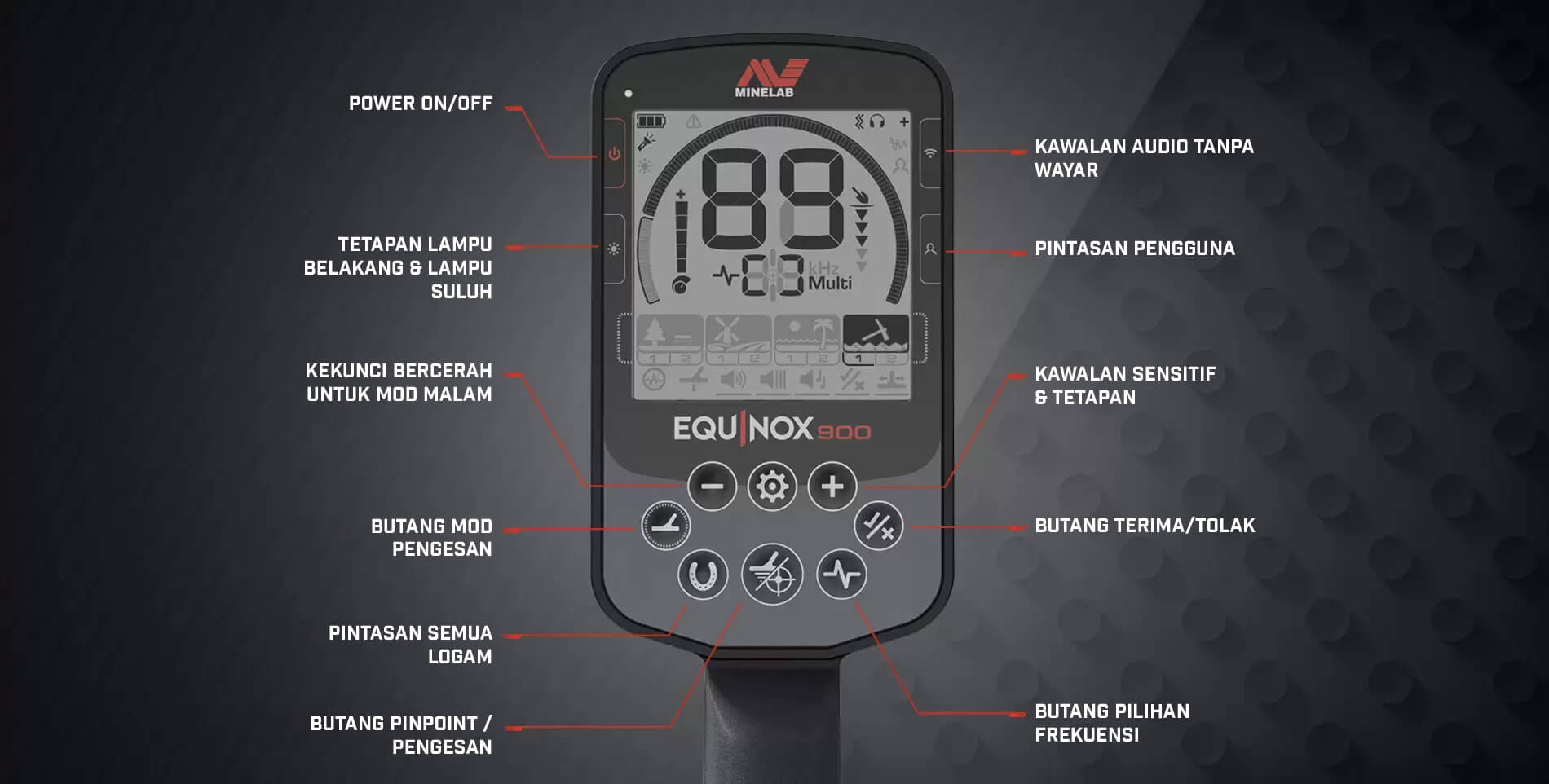 Mengapa Minelab Multi-IQ? Dengan teknologi Multi-IQ Minelab yang revolusioner, anda mempunyai kekuatan gabungan pelbagai pengesan dalam satu — semuanya berfungsi serentak untuk anda. Tiada yang akan tertinggal dan tiada medan yang terhad. Sama ada perak, emas atau barang kemas, di taman, ladang atau pantai, keluarkan kuasa EQUINOX dengan Multi-IQ.