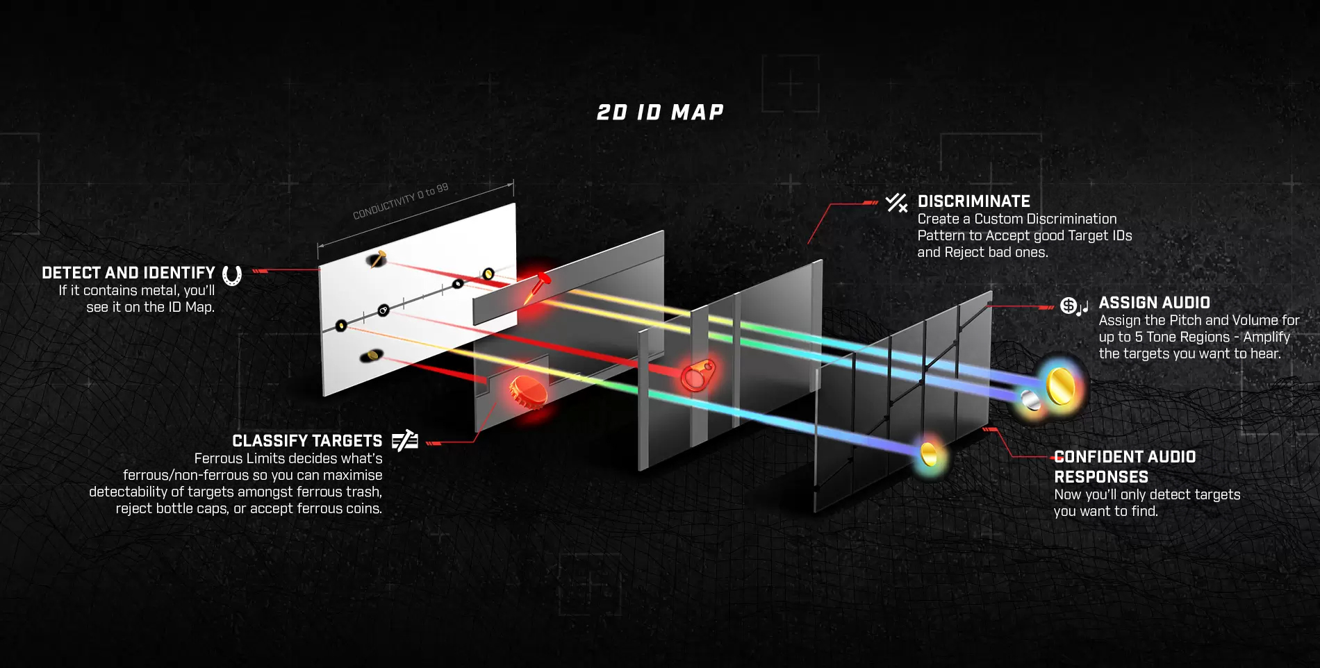 Audio your way: MANTICORE offers personalized audio control, allowing you to hear target information the way you prefer. With advanced audio controls such as customizable target tones, electromagnetic interference (EMI) suppression, and continuous pitch audio (VCO) with ferrous tones and genuine detection threshold, you can tailor the sound of targets to your preferences. This unique target tone setting divides the target identification range into zones, allowing you to adjust the width, sound, and volume of each area to highlight or minimize the presence of targets during your detections.