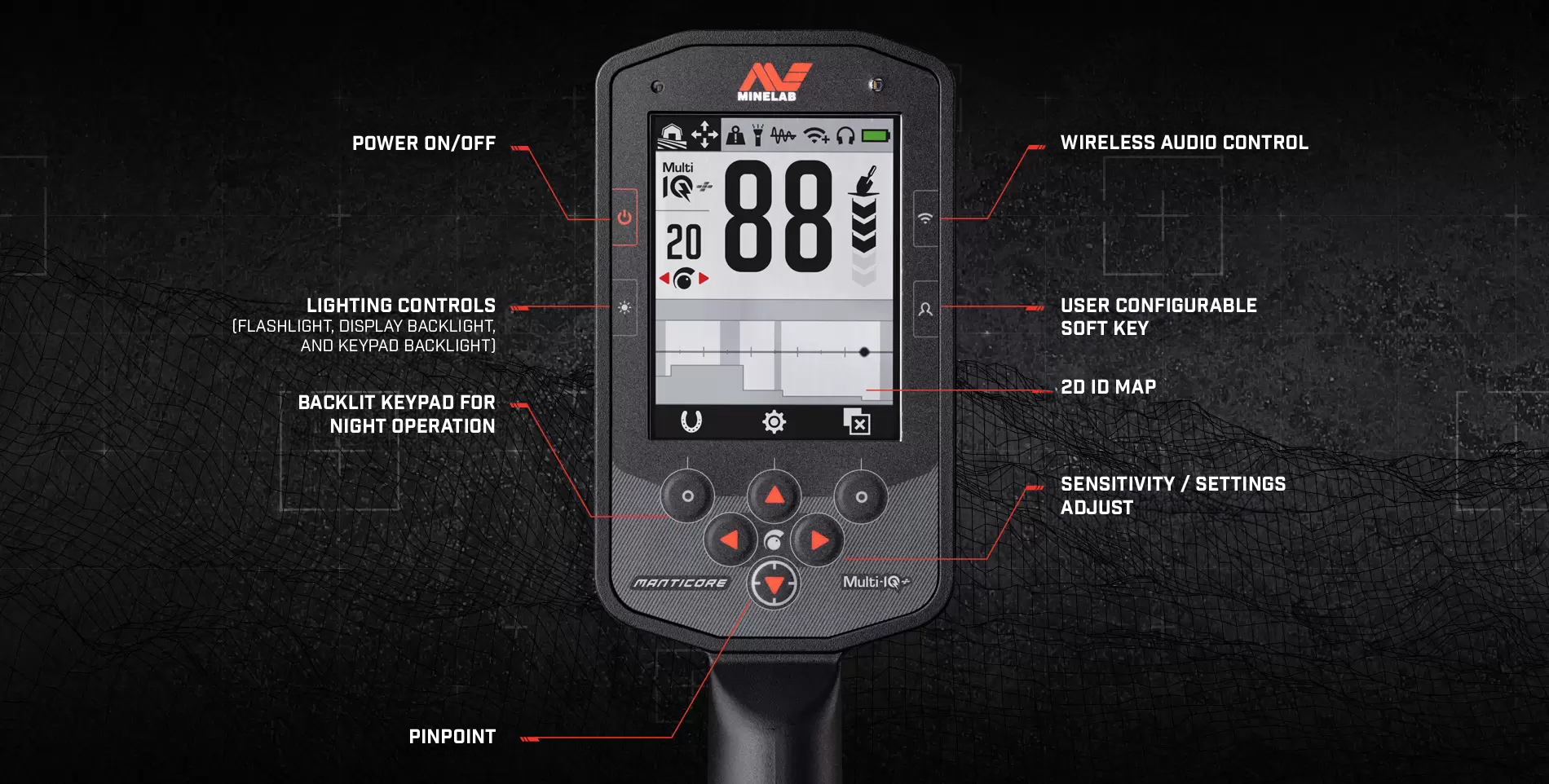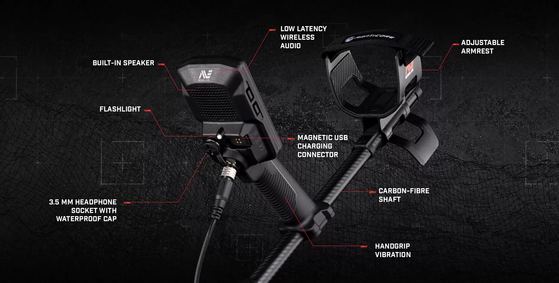 Lighting and vibration: MANTICORE offers lighting and vibration features that allow your search to continue even after dark. With the Control Pod flashlight, automatic backlighting of the display and keyboard, and vibration in the grip, you can continue your detections long after the sun has set, ensuring a convenient and efficient detection experience.