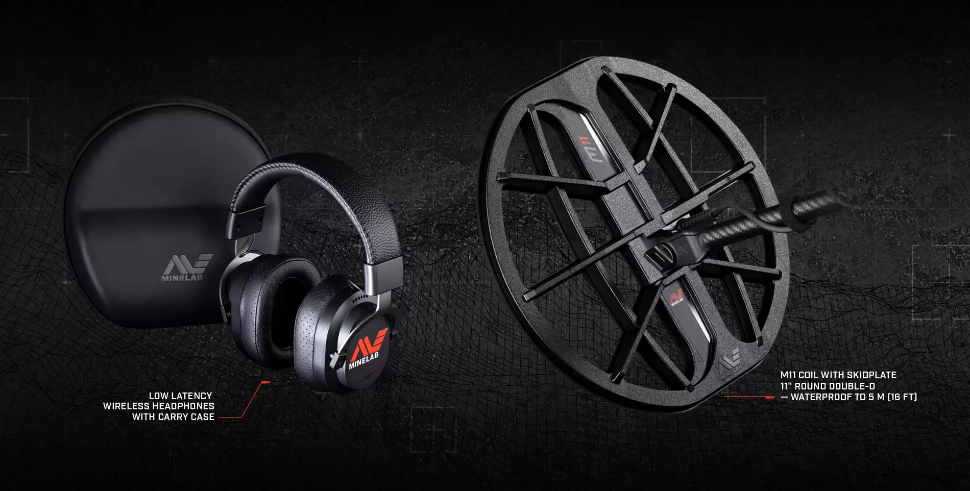 Minelab low-latency wireless headphones, which include a carrying case;